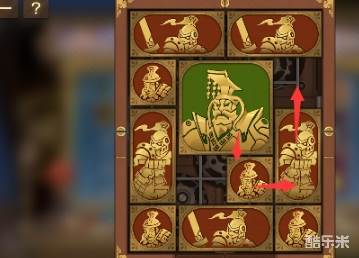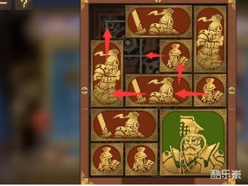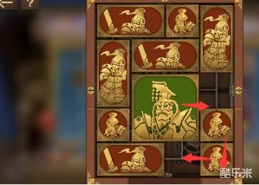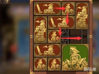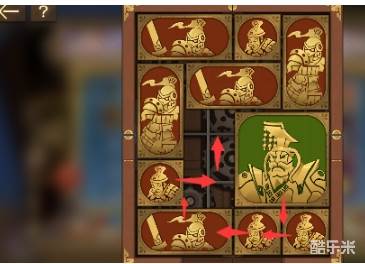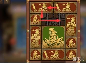 1、先将右侧的正方形向上移动,再将其左边的正方形向右移动,然后让将军向下一格。