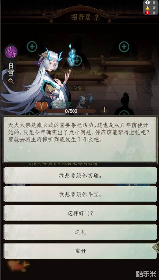 好感度达到一定程度的NPC有几率在每天赠送你一件物品,这有可能是强力的武器,也有可能是你梦寐以求的功法!