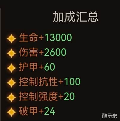 这套天赋方案获得13000生命值、2600伤害、60护甲、100控制抗性、20控制强度和24破甲。