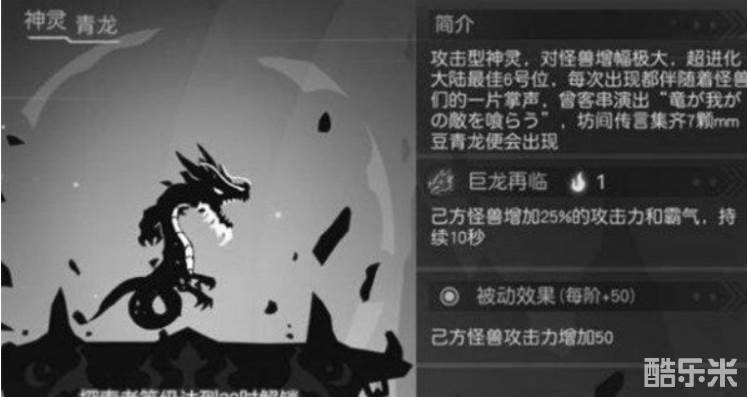 探索者33级解锁,攻击型神灵,对己方怪兽增幅极大,有了青龙坐镇的怪兽军团,无异于如虎添翼。