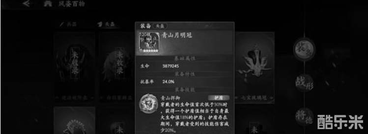 青山捍御:穿戴者的生命值首次低于30%时,获得一个护盾值相当于自身最大生命值18%的护盾;护盾存在期间,穿戴者受到的技能伤害减少20%。