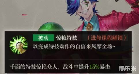 他的被动技能叫做“惊艳时刻”,这个需要玩家进修课程来进行解锁,它的效果是可以在战斗中为千面提高百分之十五的暴击,而他的被动技能则叫做“搞怪弹射”,也是需要进修课程才能解锁,可以瞄准后排的敌人,精准投掷杂技球,并对目标造成百分之七十二的伤害,每五秒可以释放一次,再加上他本身的高暴击和高爆伤,非常建议大家培养起来。