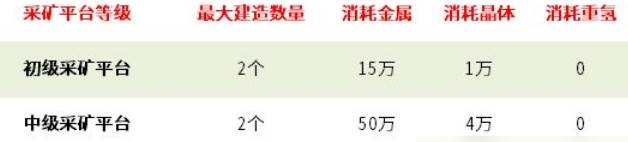 采矿平台分为初、中、高级三种,等级越高,建造时所需的资源也越多。随着基地的扩建和相关设施的建造,中级、高级采矿平台会相继解锁。