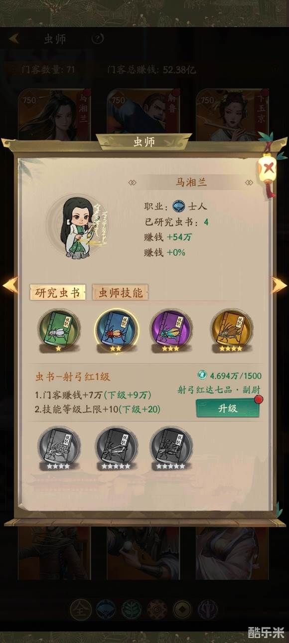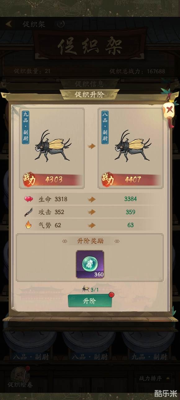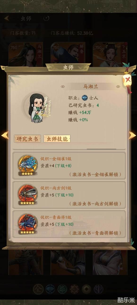 虫子升阶的战力不直接到门客,单纯的是虫的战力,大概率是后面斗虫功能用的,升阶给的道具用来开新的丹槽,还有绘卷成就进度