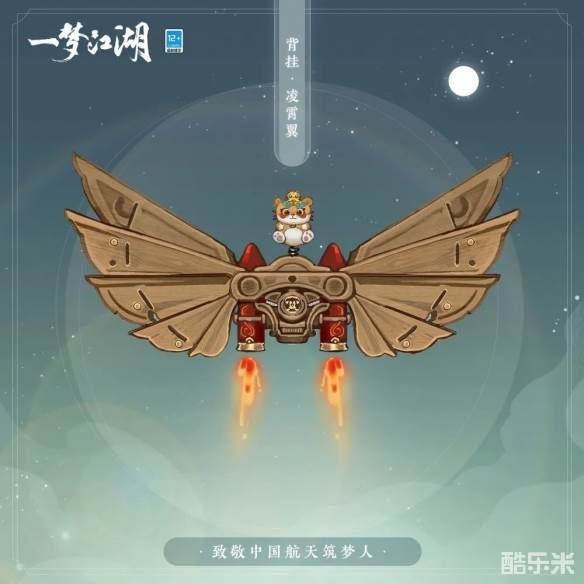 《一梦江湖》全新推出的【背挂·凌霄翼】以鸟翼为原型,通过复杂的机关术制作而成,在造型上还参考了神舟飞天之势,致敬中国航天筑梦人。远远望去,就能感受到雄伟的飞天意蕴。凑近一看,还能看到一只棕黄色的老虎坐在背包上,随着少侠的动作摇头晃脑,炯炯有神的大眼睛配上俏皮的腮红,生动可爱。