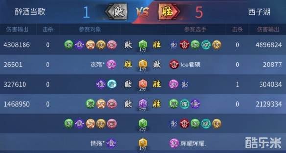 在第二局的单人赛中,醉酒当歌战队的夜殇*对西子湖战队的Ice君硕进行变狐+混乱,同时开启了一波输出。在黄鹤绕碧树与青龙·灭的对决之后,醉酒当歌战队领先了伤害优势并保持至比赛结束,追平比分。