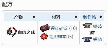 合成获得:玩家可以在铁砧或者铅砧附近,使用10个猩红矿锭+5个组织样本,可以获得1个血肉之球。