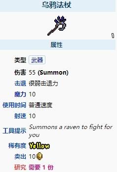 1、乌鸦法杖是困难模式中世纪之花之后的召唤武器。它能生成跟随玩家并以近战攻击敌怪的乌鸦角色。