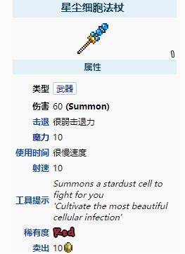 1、星尘细胞法杖是一件困难模式中电脑独有的召唤武器,它会召唤星尘细胞(仆从版本的星尘细胞敌怪)为玩家作战。