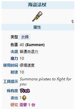 1、海盗法杖是一把困难模式、机械Boss之前的召唤武器,可以生成一名海盗跟随玩家并使用一把刀攻击敌怪。
