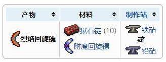 合成获得:玩家在铁砧或铅砧处,使用10个狱石锭+1个附魔回旋镖,可以获得1个烈焰回旋镖。