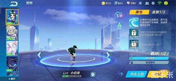 比赛时幻化成尾挂,氮气或加速带时产生拖尾,加速度提升4.4%,最高可提升至11.4%。此属性的增益数值在所有宠物中处于顶端。