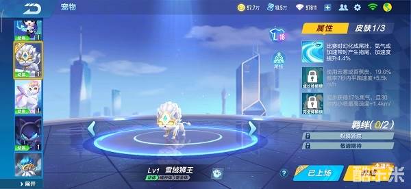 比赛时幻化成尾挂,氮气或加速带时产生拖尾,加速度提升4.4%,最高可提升至11.4%。此属性的增益数值在所有宠物中处于顶端。