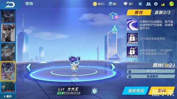 比赛时幻化成尾挂,氮气或加速带时产生拖尾,加速度提升3%,最高可提升至8.5%。此属性的增益数值在所有宠物中处于中下水平。