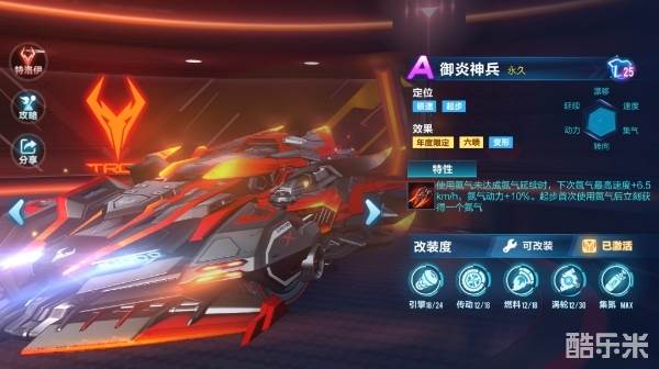 御炎神兵是特洛伊车厂推出的牛年限定六喷A车之一,赛车采用黑色和红色的搭配,充满攻击性的外表散发着令敌人胆寒的气息。赛车的各项属性非常优秀,尤其在集气方面尤为突出。