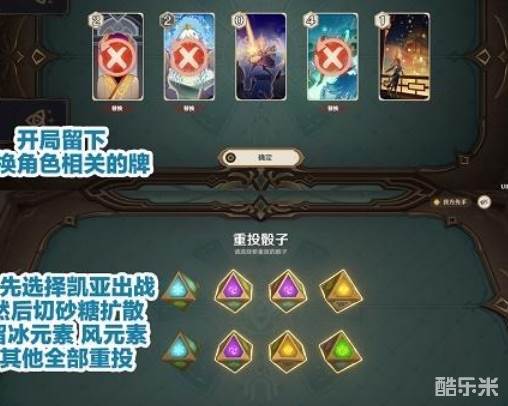 1、开局留下切换角色相关的卡牌,首先选择凯亚出站然后切砂糖扩散留冰元素、风元素,其他全部重投,可以先打出相关的事件牌。