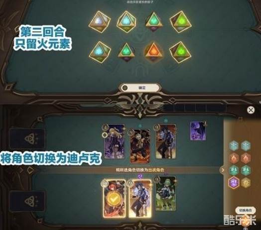 3、第三回合只留火元素,把角色切换成迪卢克,对对方使用元素战技打出融化反应,如果火骰子不多用手牌去置换。