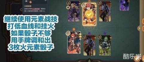 4、继续使用元素战技打低血线和挂火,如果骰子不够用手牌调和出3枚火元素骰子,第三回合留风元素将角色切换成砂糖。