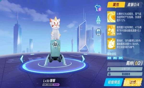 比赛时幻化成尾挂,氮气或加速带时产生拖尾,加速度提升4.8%,最高提升至12%。此属性的增益数值在所有宠物中处于上等水平。