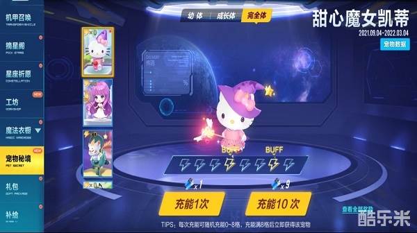 甜心魔女凯蒂上架宠物秘境,前往宠物秘境使用宠物能量完成充能即可获得永久甜心魔女凯蒂!喜欢Kitty的小伙伴千万不要错过!