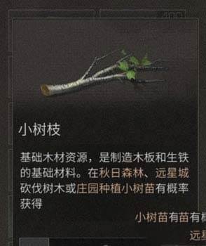 最好入手小树枝的方法就是种树,玩家需要在家里面种植一些小树苗,然后通过这些小树就可以砍伐得到大量的小树枝,这个可以说是非常划算的一个方法了,毕竟你自己去野外砍树的话,得到的几率不大,而如果你种树来砍伐的话,一般一棵树可以得到十几个小树枝,小编比较建议去使用铁斧来砍伐,同时在在采集技能里面可以加天赋点获取小树枝的概率。