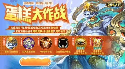2022年12月9日-2023年1月2日,全新周年福利活动——蛋糕大作战火热开启!通过每日登录、对局点赞、组队完成对局等任务获得仙桃道具,累计消耗仙桃将获得白虎星君皮肤礼包、白虎星君头像框、守6相伴守卫皮肤、国艺风华幸运券等精美好礼!注意:白虎星君皮肤礼包于12月16日雪豹新皮肤“白虎星君”上线后才可打开。