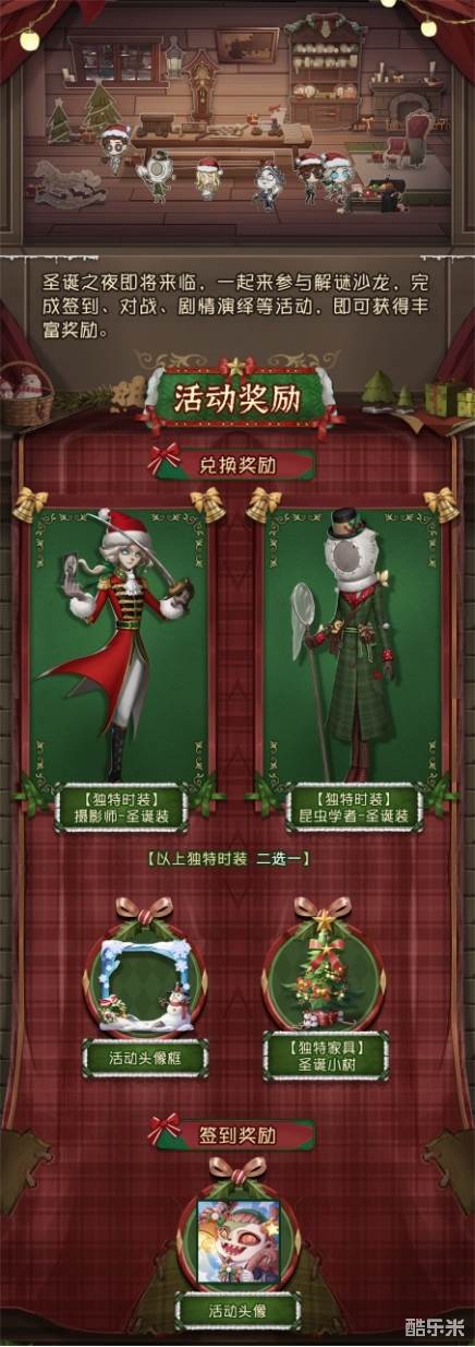 12月15日维护后,“圣诞夜之谜”主题活动将开启,玩家们前往参与揭秘沙龙,完成签到、对战和剧情推演等任务,即可获得包括独特家具-圣诞小树、活动头像、活动头像框在内的精美奖励,并可从摄影师-圣诞装和昆虫学者-圣诞装中择一获取。让我们一起用圣诞元素,装点这美好夜晚吧!