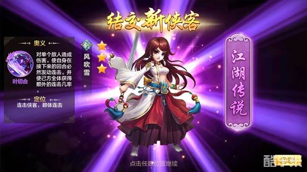 游戏中侠客的奥义十分的贴合侠客人物设定,例如风吹雪原为天意城杀手,爆发力极强,讲究一击必杀!因此,在《侠客风云传online》中,风吹雪的初始奥义为“叶切合”:可以增加自己的伤害,并对单个敌人造成大量伤害和持续流血的效果。而湘芸作为神医后代,奥义则是“春风化雨”:回复所有队友的生命值。当然,游戏中还有更多的侠客及奥义等待玩家去发掘并搭配使用。