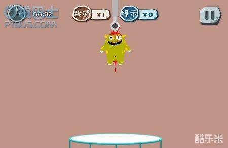 第三十一关:先把上面吊灯一样的东西放下来,会露出针头,然后让怪兽去蹦高(想下来蹦床即可)。