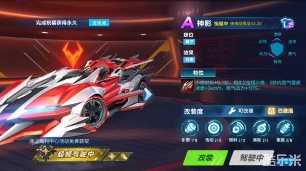 特性:小喷时长+0.1秒,每8次使用小喷,5秒内氮气最高速度+3km/h,氮气动力+10%。