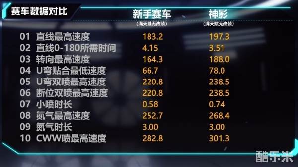 从赛车的六维特性图上可以看出,神影的延续十分突出,速度,转向也十分优秀。在实战中更长的小喷可以降低氮气延续时的失误率。优秀的转向也能为出弯提供更好的路线。