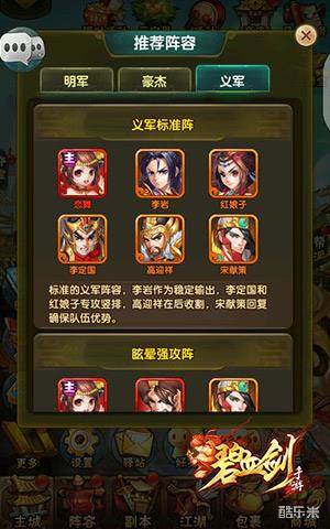 《碧血剑》手游中分为明军、豪杰和义军三大阵营,每个阵营又有数十位不同的英雄的,不同英雄搭配可以组成不同类型的阵容。如攻防平衡的标准阵容、争夺战场先机的昏眩强攻阵容、保存自身实力的减伤强攻阵容和双红将出战的回怒高攻阵容等各具特色的阵容。不过因为游戏在阵容培养方面的高度自由,即使是同样的英雄阵容,不同玩家发挥出的实力也是高低分明。建议刚接触游戏的玩家,可以先按照游戏推荐的阵容进行培养!