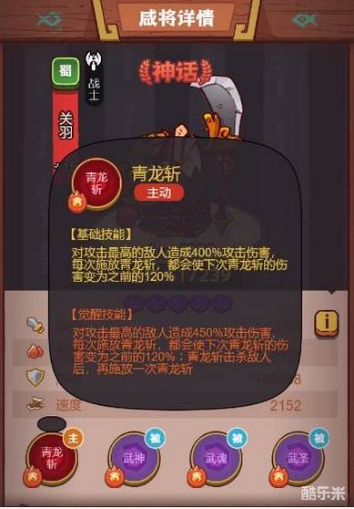 技能分析:关羽主动技能青龙斩的释放效果是对攻击最高的敌人造成400%攻击伤害每次施放青龙斩,都会使下次青龙斩的伤害变为之前的120%。可以看的出来关羽是一个点杀非常好用的咸将,可以针对一些敌方阵容存在高输出的情况是非常好用的,其余可以搭配一些带有控制效果以及群体攻击的咸将最为恰当。