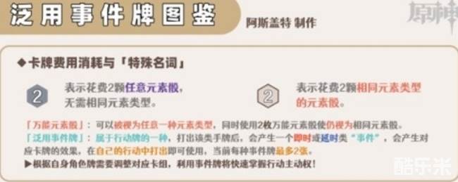 1、最为基础的事件牌,只要满足元素骰要求,在自己的行动回合内即可打出,当前共15张