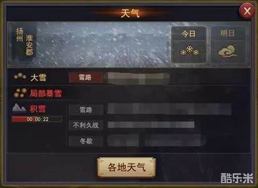 在游戏中,各州各郡的天气,都将从地理上与现实各区域的实时天气保持一致。在世界地图上,各位主公可以查看今日各地的天气情况。