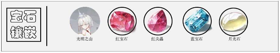 光明之山很适合位移技能次数多和cd快的角色,阿斯莫德就是这么一位神格。剩下的孔位优先选择攻击属性的宝石,最后一个孔位则可根据自身需求选择生命或防御属性的宝石如:红宝石+攻击、月光石+暗月防御、红尖晶+攻击百分比、蓝宝石+防御。