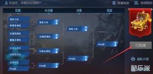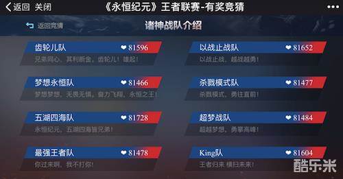 本次出征的战队如下,各个队伍名称各有特色,各有各的霸气,其中“最强王者队”、“King队”都是叫王者队,到底谁才是王者呢?不过虽然名字好听,但最终是否能一一打败对手拿到我们最高荣誉奖杯,还是要看实力。