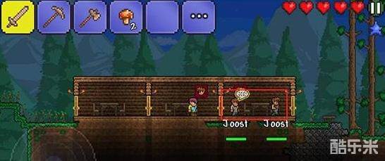 1、除了被攻击以外,大宝箱怪只有在与玩家距离为四格时主动进行攻击,并且玩家也可以在四格外打开宝箱因此工作台所在平台前需要有一个4×4的木块堆。