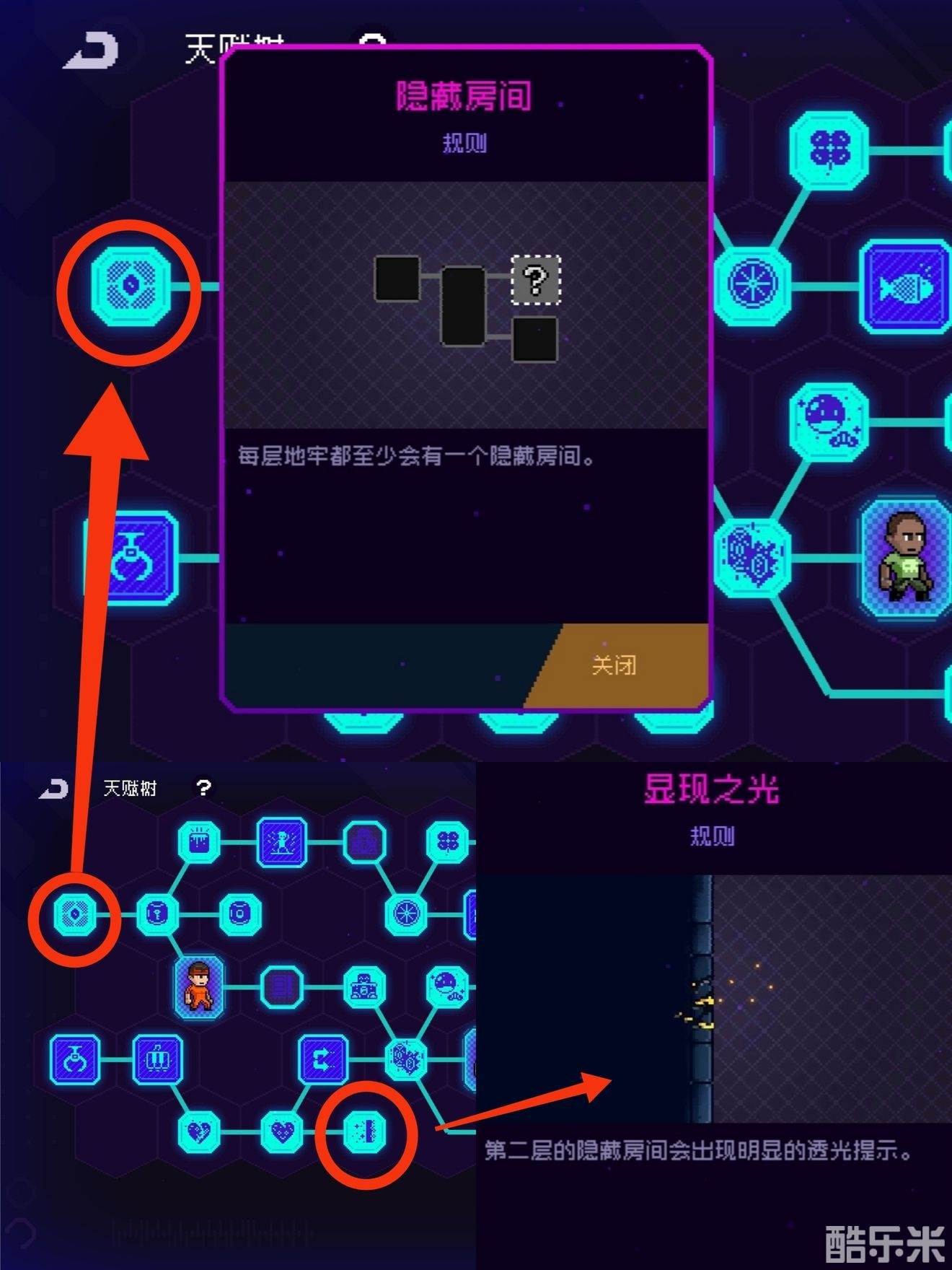 1、隐藏房间需要在[天赋]升级中解锁,之后才能在关卡中遇到。建议配合[显现之光]使用。