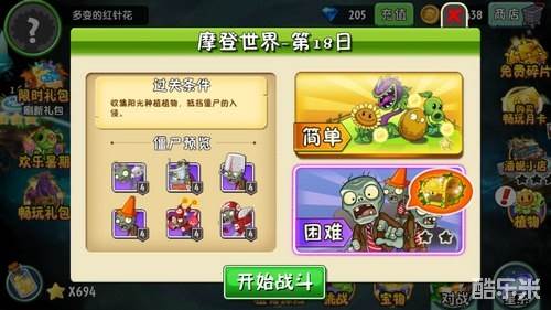 摩登世界第18日过关条件:收集阳光种植植物,抵挡僵尸的入侵。