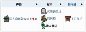 1个优质钓鱼线、1个钓鱼箱以及1个渔夫耳环在工匠作坊可以合成1个渔夫渔具袋。