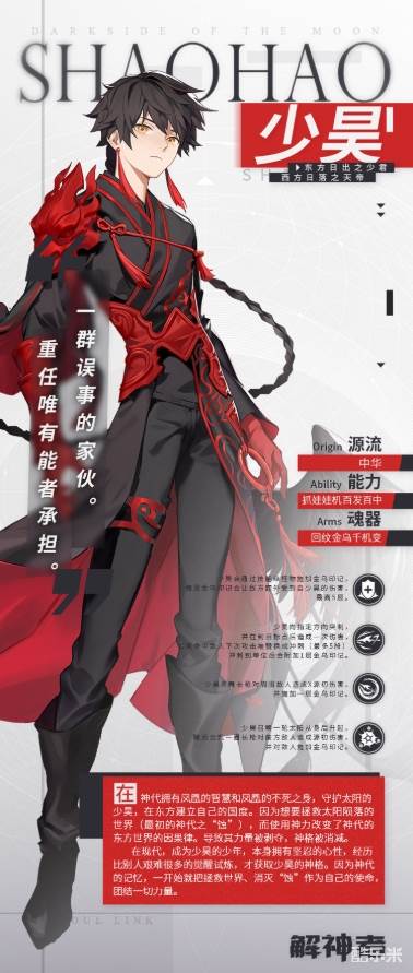 东方日出之少君,西方日落之天帝。地在鲁城北,凤鸟为图腾;凤凰的智慧,涅槃重生的不死之身,永远的守护太阳吧。纵使力量被剥夺,神格被削减,甚至篡改世界的因果律,也一定要—拯救太阳陨落的世界!
