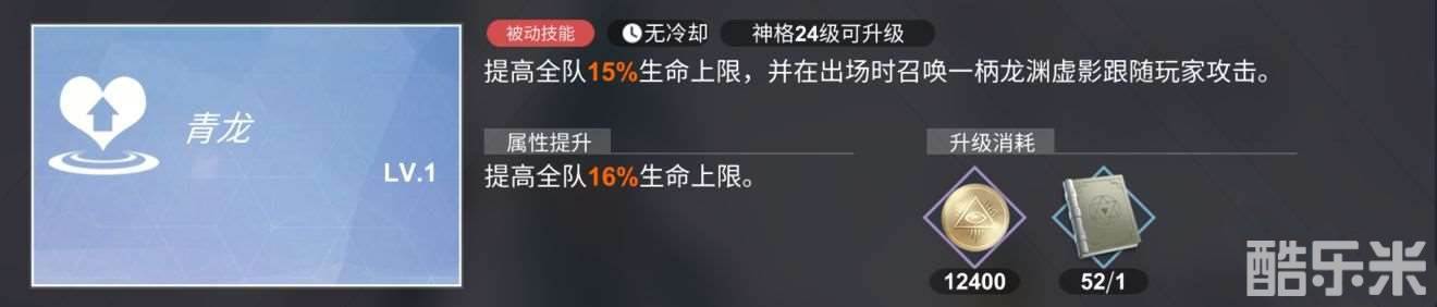 提高全队百分比的生命上限,并在出场时召唤柄龙渊虚影跟着朋友攻击。