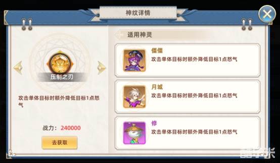 压制之刃是非常完美的契合暗影阵营的神灵月城了,月城的技能攻击为对敌方的后排神灵造成眩晕与减少怒气,月城搭配上“眩晕飞弹”与“压制之刃”的话可以大大的降低对方后排神灵的怒气与增加控制,对后排治疗系神灵的威胁是非常大的哦~