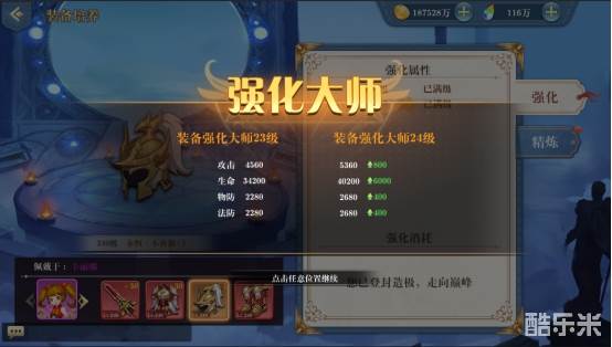 消耗“金币”可以提升装备的强化等级,获得大量基础属性,并且当神灵全身装备都强化到特定等级时,会激活强化大师,可获得额外的基础属性。