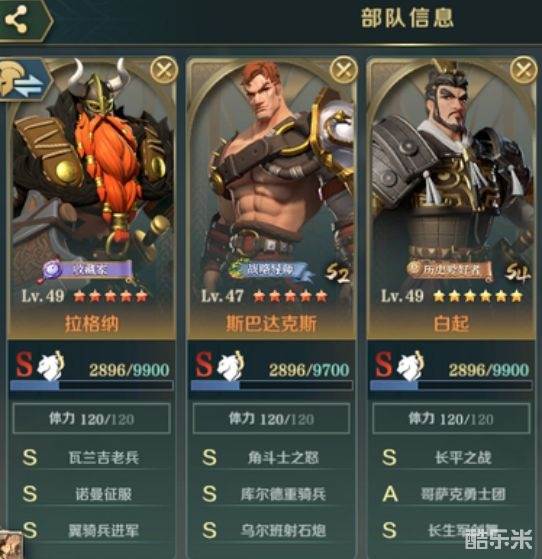 在这套阵容中,白起作为辅助,主要提供使敌方跳过回合的恐怖效果,斯巴达克斯为队伍提供连击次数,同时携带增益技能为主将提供力量加成和伤害补充,而主将天命拉格纳的自带技能可以使自身突击伤害无视目标防御,配合相关技能可以打出极其爆炸的输出。
