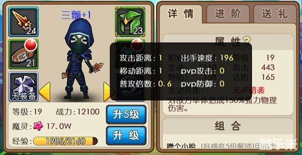在我叫MT外传角色详情界面,右侧属性栏的问号可以点击,以此查看角色的攻击距离、速度、移动距离、PVP攻击、PVP防御、和普通攻击的倍数。这里要讲解一下普攻倍数和出手速度这个2个特殊属性!