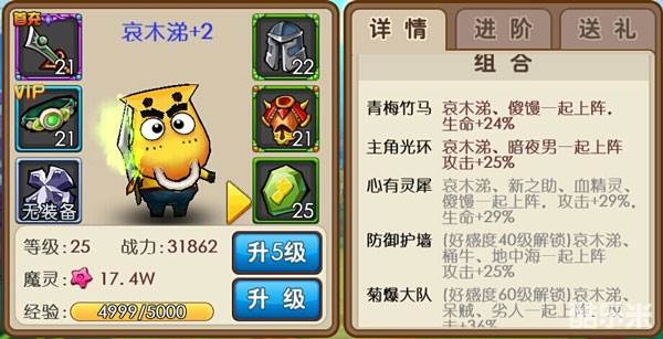 组合系统上,只要玩家派上阵的角色与角色之间有组合,并且好感等级达到,就会解锁,角色会获得该组合的属性加成。如上图,哀木涕与傻馒的“青梅竹马”组合属性就是符合条件解锁的属性,那么傻馒和哀木涕都会获得额外的24%的生命值加成。如果好感度有一方没达到,那么没达到的一方是无法获得组合属性加成的,而达到的一方仍然可以获得组合属性加成。
