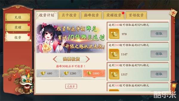 玩家等级≥巅峰31级不可投资,巅峰31级后,如果有返利未领取,不可升级档位。