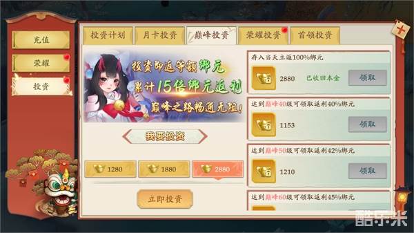 巅峰投资属于成长投资的扩充,巅峰31级开启,消耗一定元宝可以在达到特定的等级时获得返还绑元(返还总数15倍)。